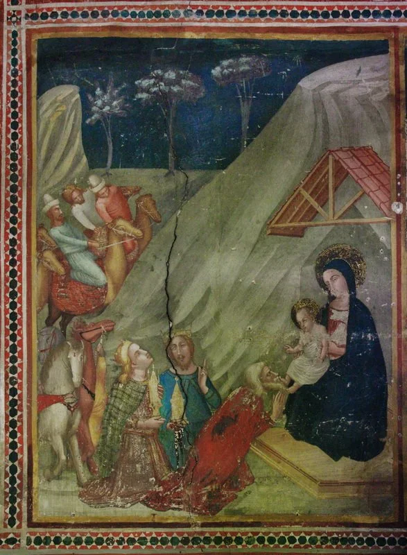 Ferrer Bassa, Epifanía, Celda de San Miguel, Monasterio de Pedralbes, Barcelona, fresco con retoques en seco al óleo y temple, aprox. 0,60 X 0,60 m., 1346.