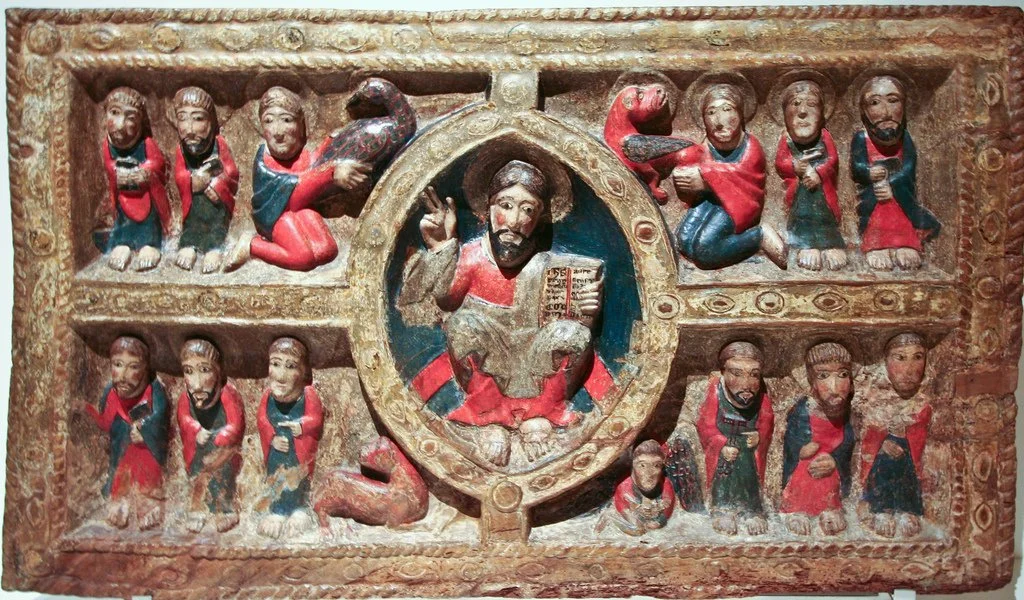 Pantocrátor con los Apóstoles y el Tetramorfos, frontal de altar, pieza de madera maciza, tallada y policromada, 84 X 144 cm; fin del s. XIII; procede de la Iglesia de Santa Margarita, de Benavent de la Conca (Pallars Jussà, Lérida); en el MNAC (Barcelona).